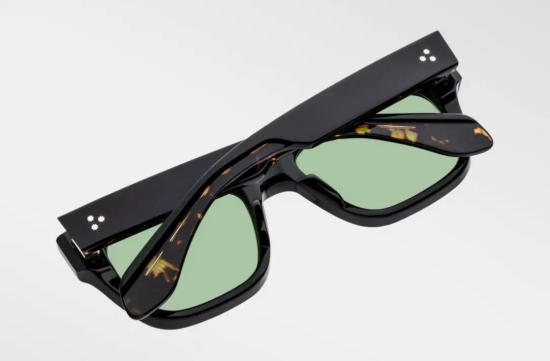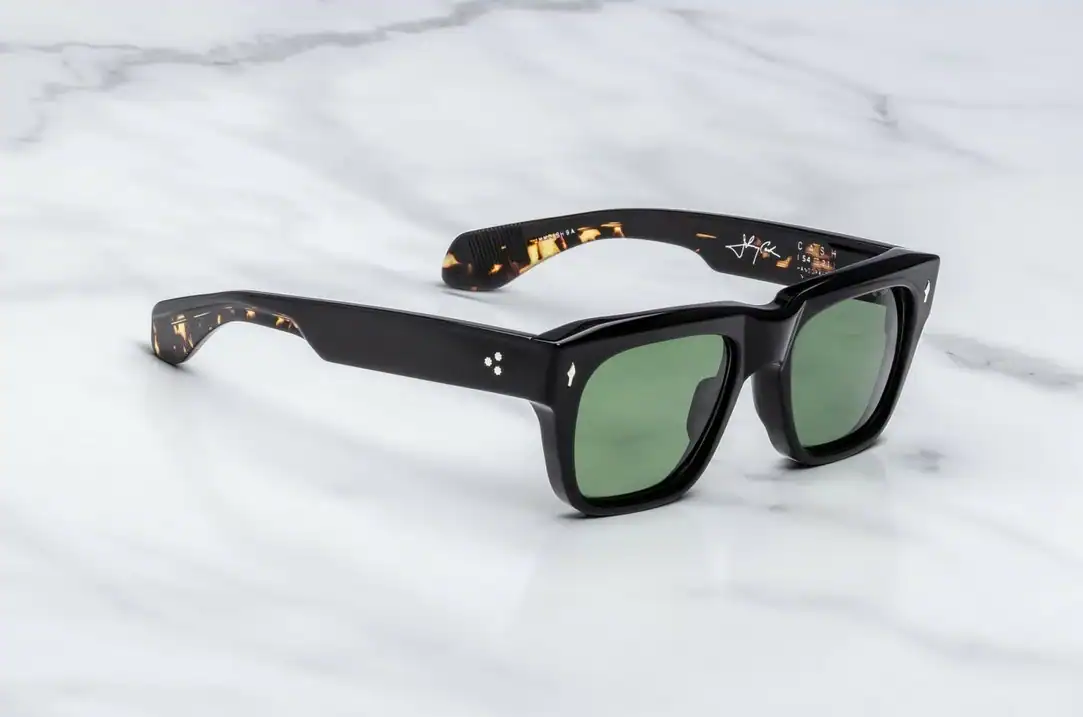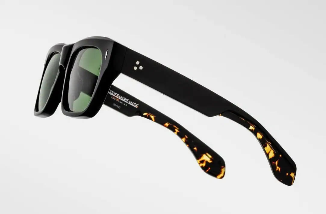 Handmade in Japan from 10 mm black acetate, spectacles Cash Noir 9 They catch the eye with their distinctive shape, thick profile and refined details. Silver arrowhead front pins highlight the heritage of the Jacques Marie Mage brand, and green Serpent Armorlite lenses give the whole thing a cinematic feel, while offering 100% UV protection i anti-reflective coating.