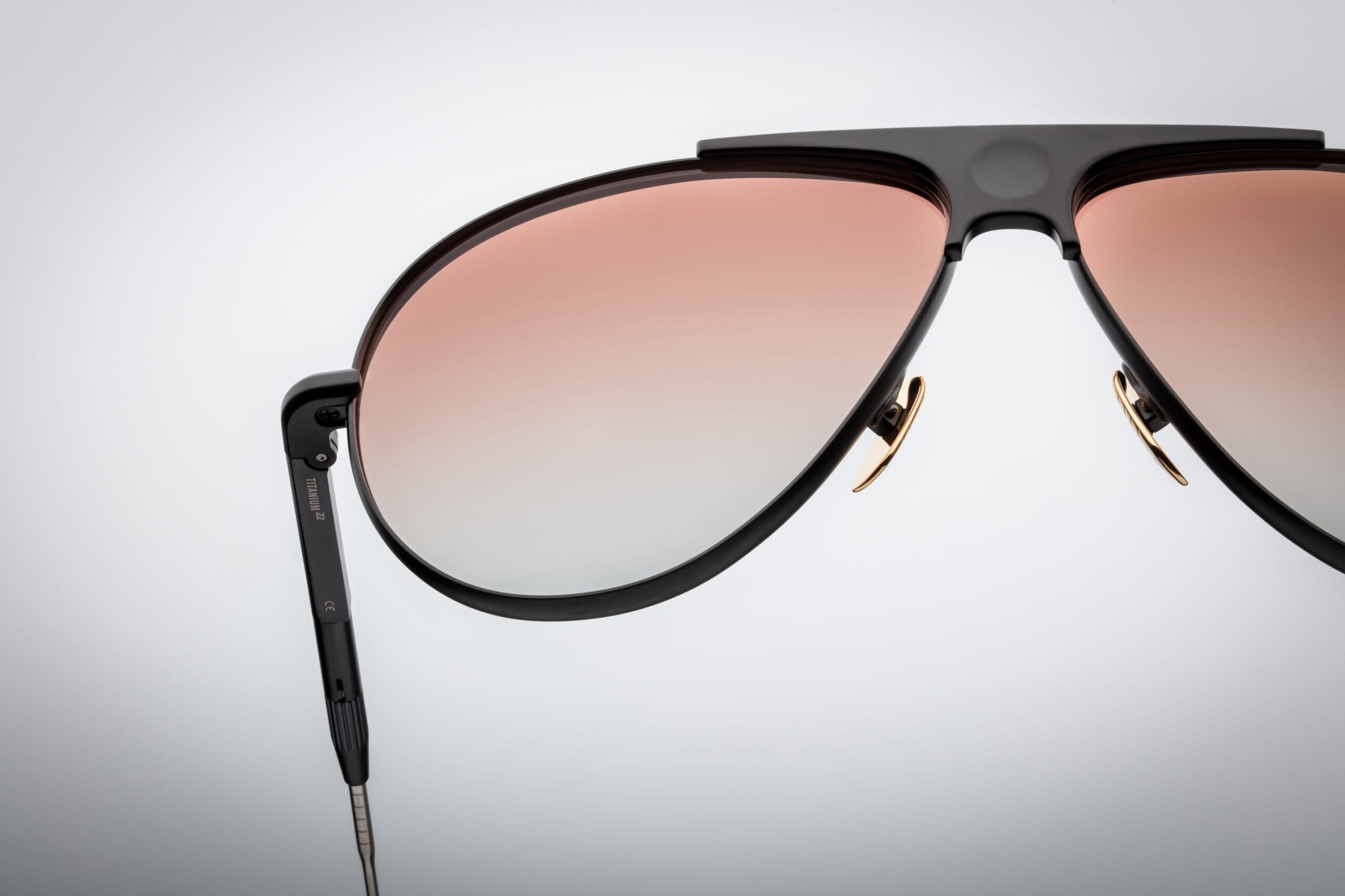 Slim design with 100% beta grade titanium delights with its details – from the unique bridge with a round recess to the engraved decorations in the style of Art Deco. Clear, orange lenses with a gradient finish introduce a warm counterpoint, adding energy and depth to the look.