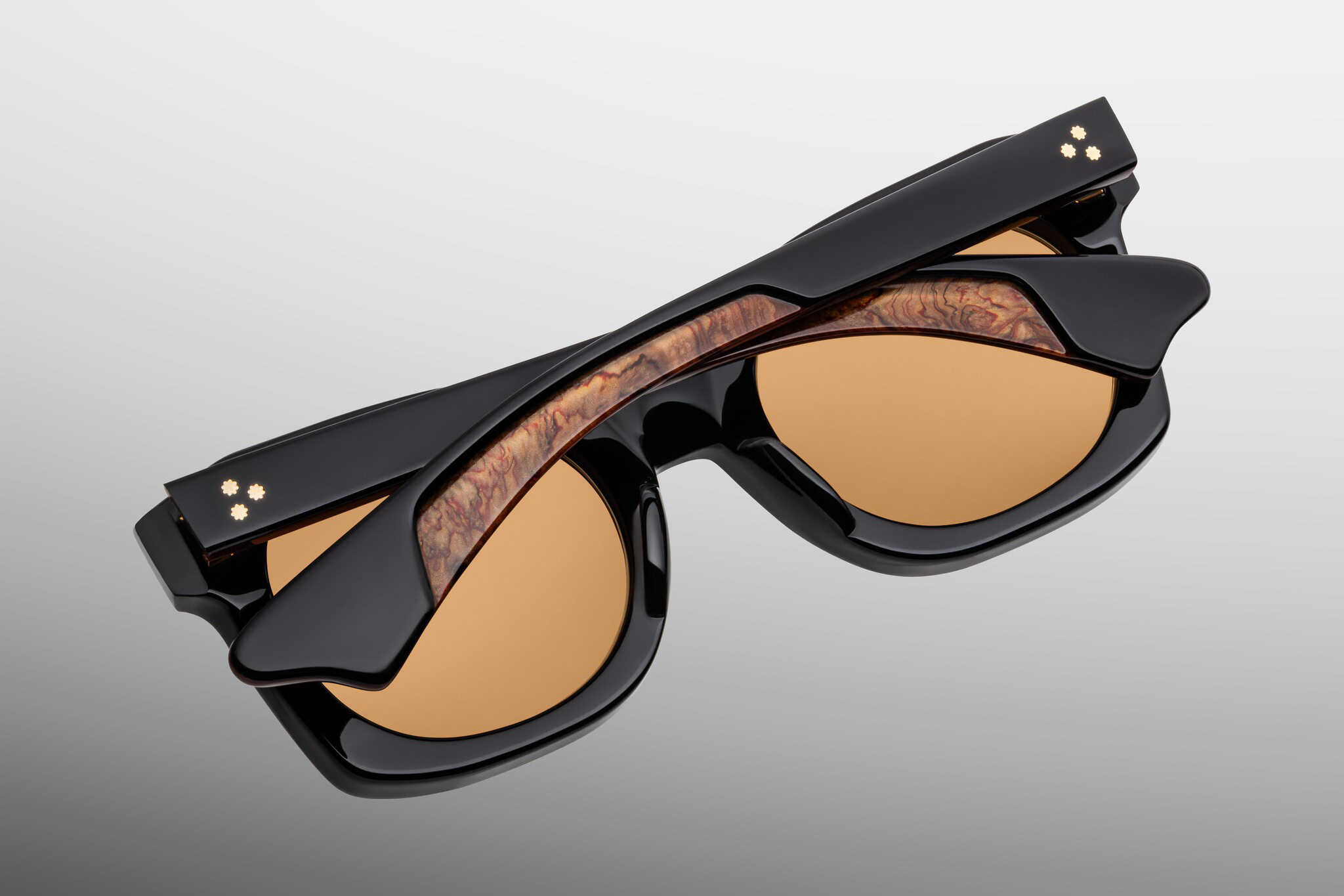 The frame is decorated with signature front pins in the shape of arrowheads, finished in dark gold, and hidden „Classic” wirecore in the same shade, visible subtly beneath the acetate surface. The whole is complemented by proprietary seven-barrel stainless steel hinges, decorated with Art Deco-inspired engraved details, ensuring the durability and smooth running of the mechanics.