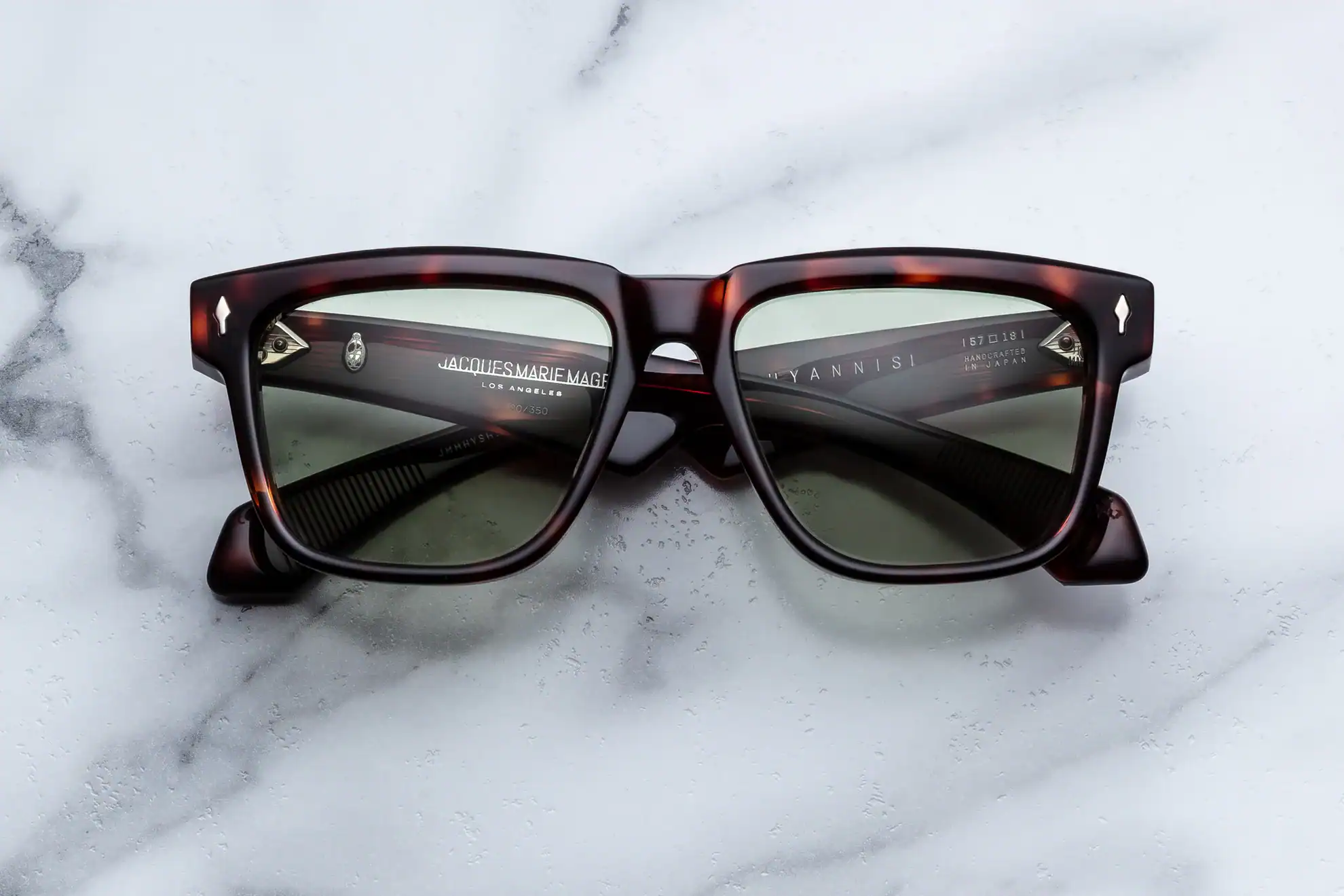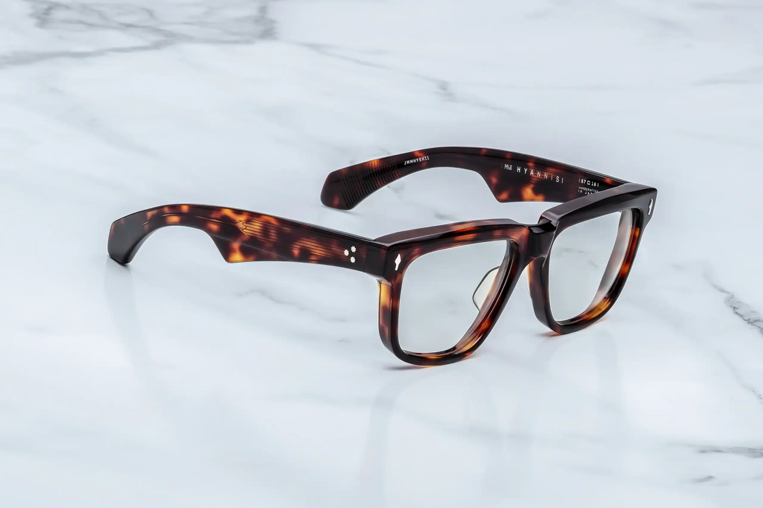 Handmade in Japan, the setting is created from 10 mm cured cellulose acetate coloured Havana, with matching havana ear cuffs - making the overall look cohesive, visually dense and extremely elegant. The finishing touch is JMM's signature jewellery: sterling silver signature arrowhead front pins, hidden Classic wirecores in the shell silver palladium, customised 7-barrel hinges with refined hairline details and spur rivets - all detailed and signed on the inside of the temples.