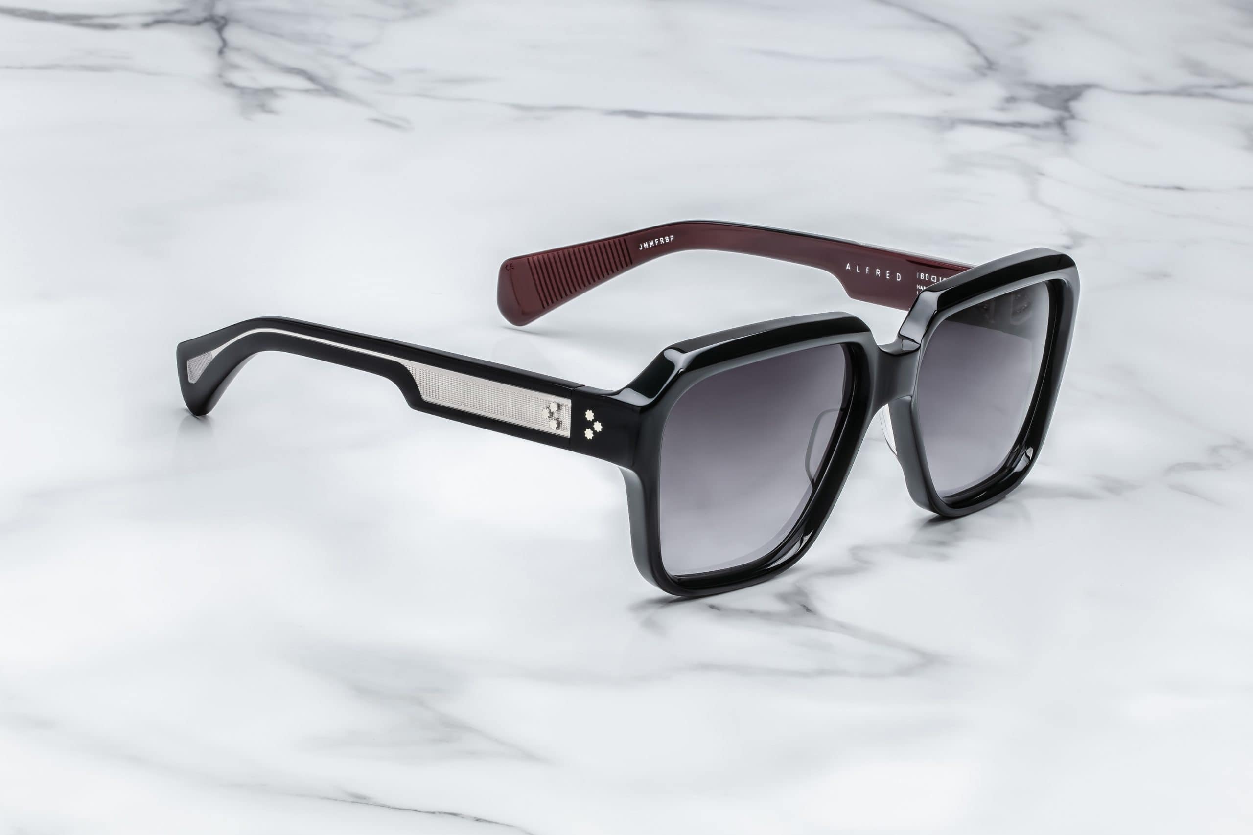 ALFRED in BLOODSTONE to rzeźbiarska interpretacja klasycznej elegancji — model o smukłej sylwetce i imponującej objętości, który natychmiast przyciąga uwagę detalem i proporcją. Oprawa została wykonana ręcznie z najwyższej jakości roślinnego acetatu celulozowego o grubości 8 mm w głębokiej czerni, uzupełnionej o podwójnie laminowane zauszniki z precyzyjnie osadzonymi elementami z metalu szlachetnego.