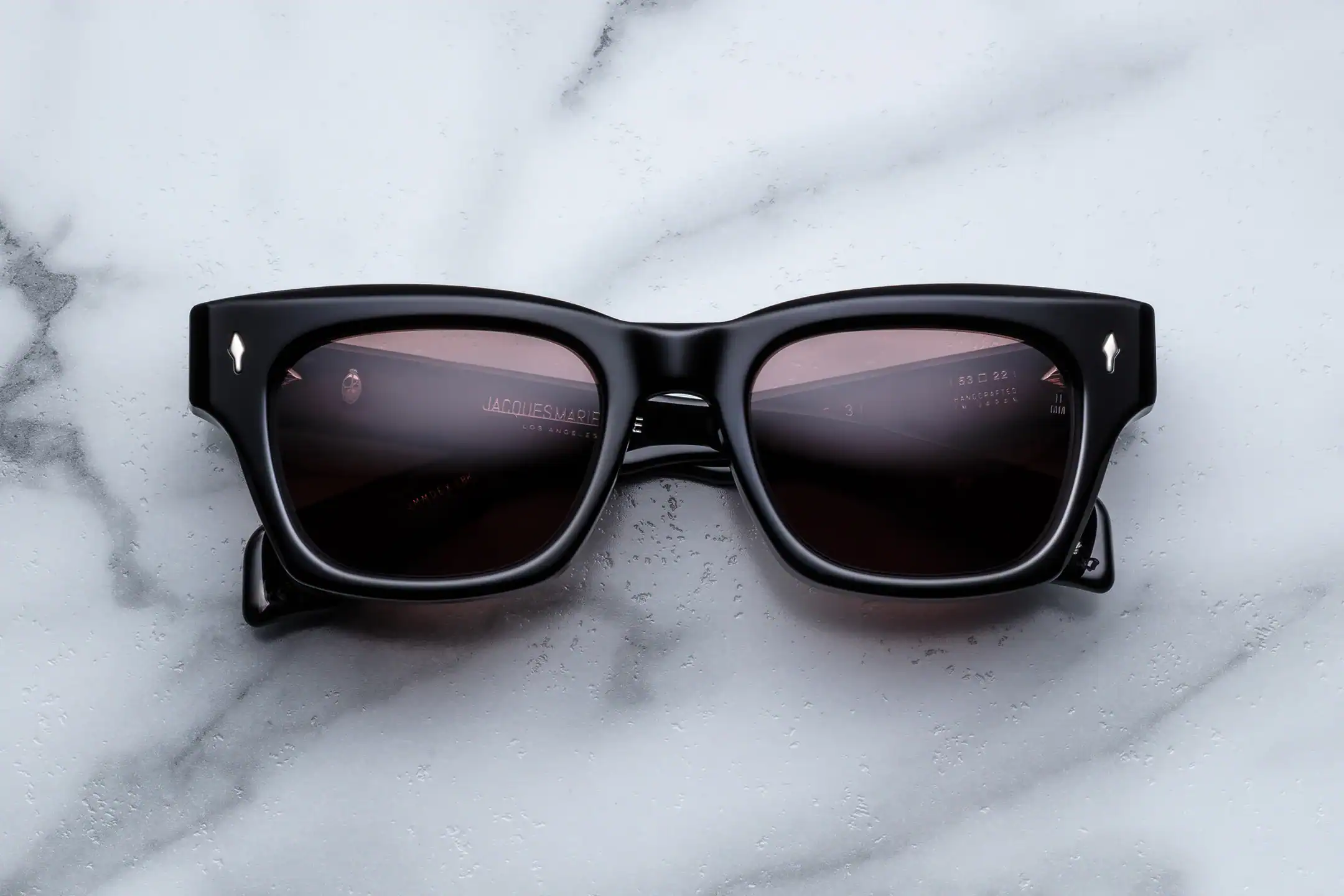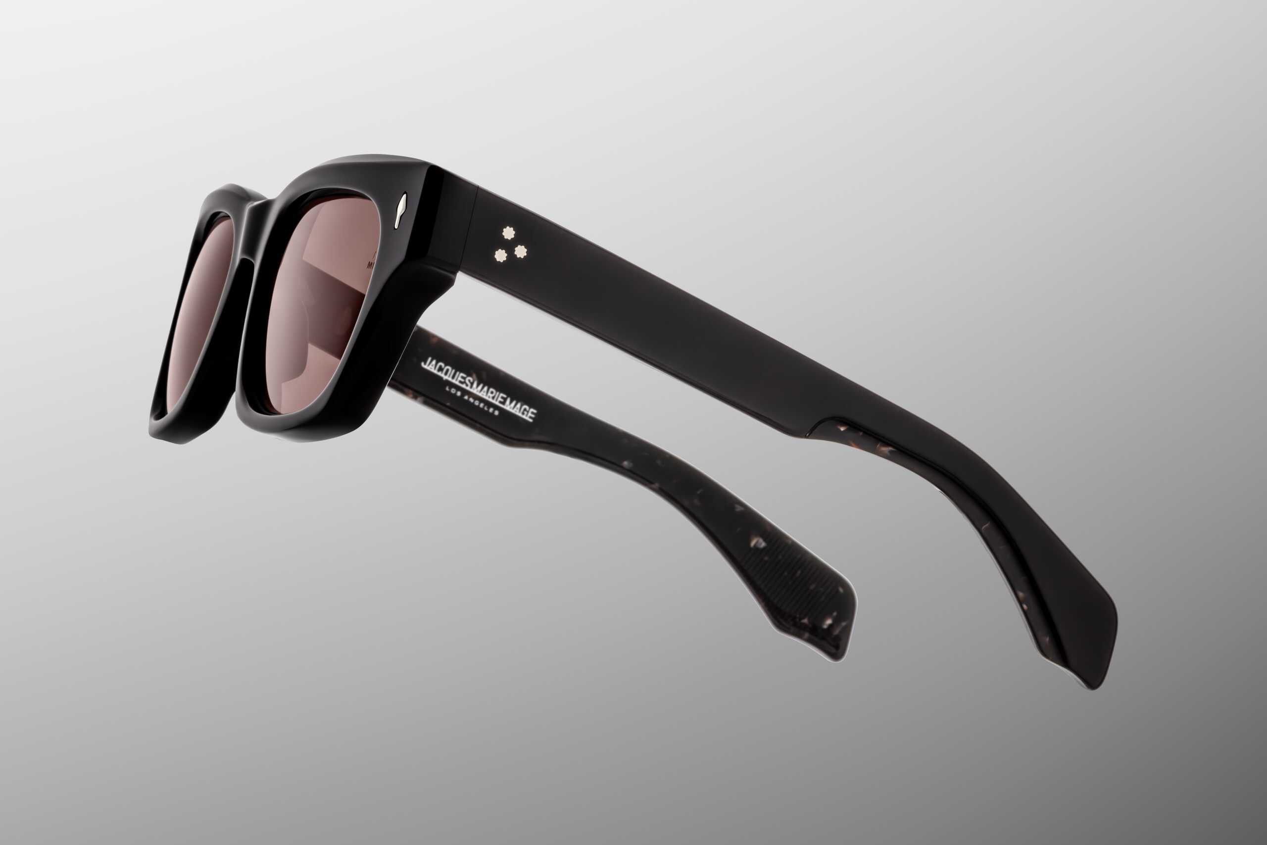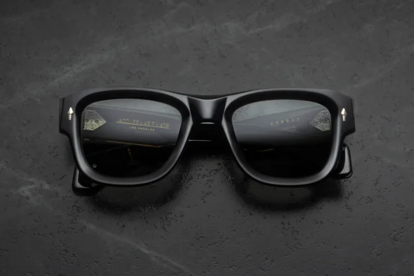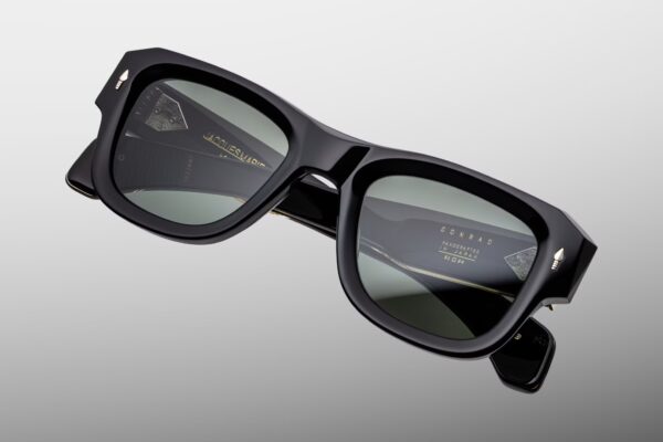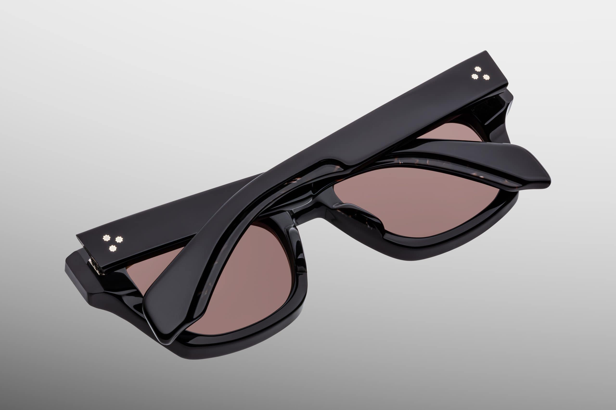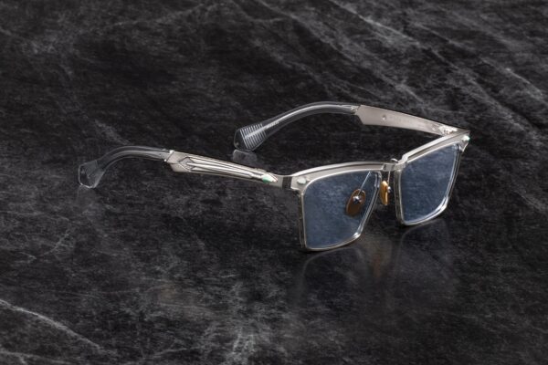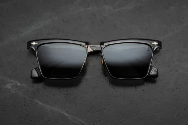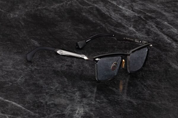 Oprawa została wykonana z 10-milimetrowego, utwardzanego acetatu celulozowego w kolorze czarnym, z charakterystycznymi, podwójnie laminowanymi zausznikami. Konstrukcję wzbogacają sygnaturowe piny frontowe w kształcie grotów ze srebra próby sterling, ukryty wirecore oraz autorskie, siedmiobaryłkowe zawiasy napinane, gwarantujące trwałość i stabilność przez lata użytkowania. Całość dopełnia kopułowe, trójwymiarowe logo cameo w kolorze srebra — subtelne, lecz jednoznacznie rozpoznawalne.